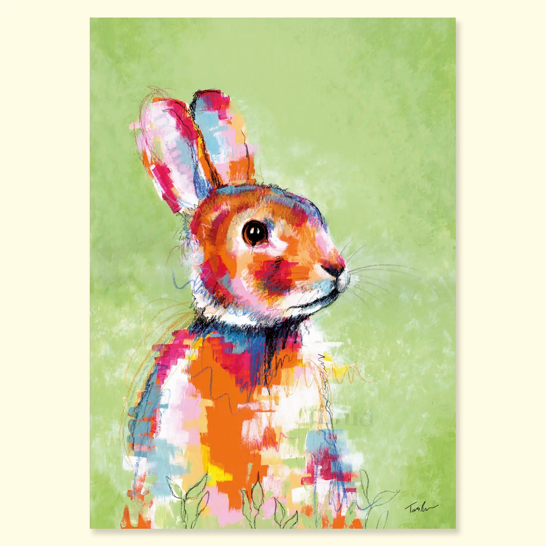 This original painting of a rabbit was created using mixed media and collage. The artwork blends bold colours and varied textures to capture the rabbit's playful nature and gentle personality in a warm, contemporary style.