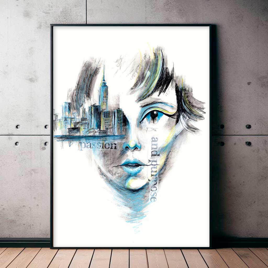 Explore the fusion of passion and purpose in this abstract portrait. With the words 'passion' and 'purpose' collaged in, it reflects the thrill of aligning personal drive with meaningful intent. A cityscape over one eye symbolises the journey of ambition and aspiration.