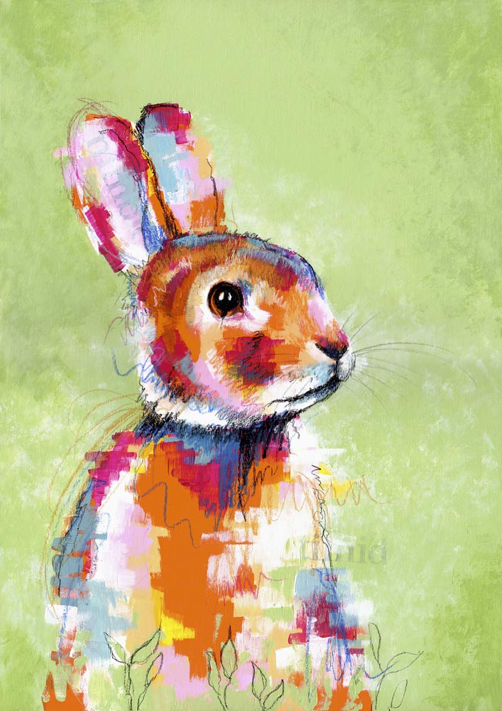 This colourful rabbit art print captures the lively spirit of a wild rabbit, perfect for fans of contemporary animal art.
