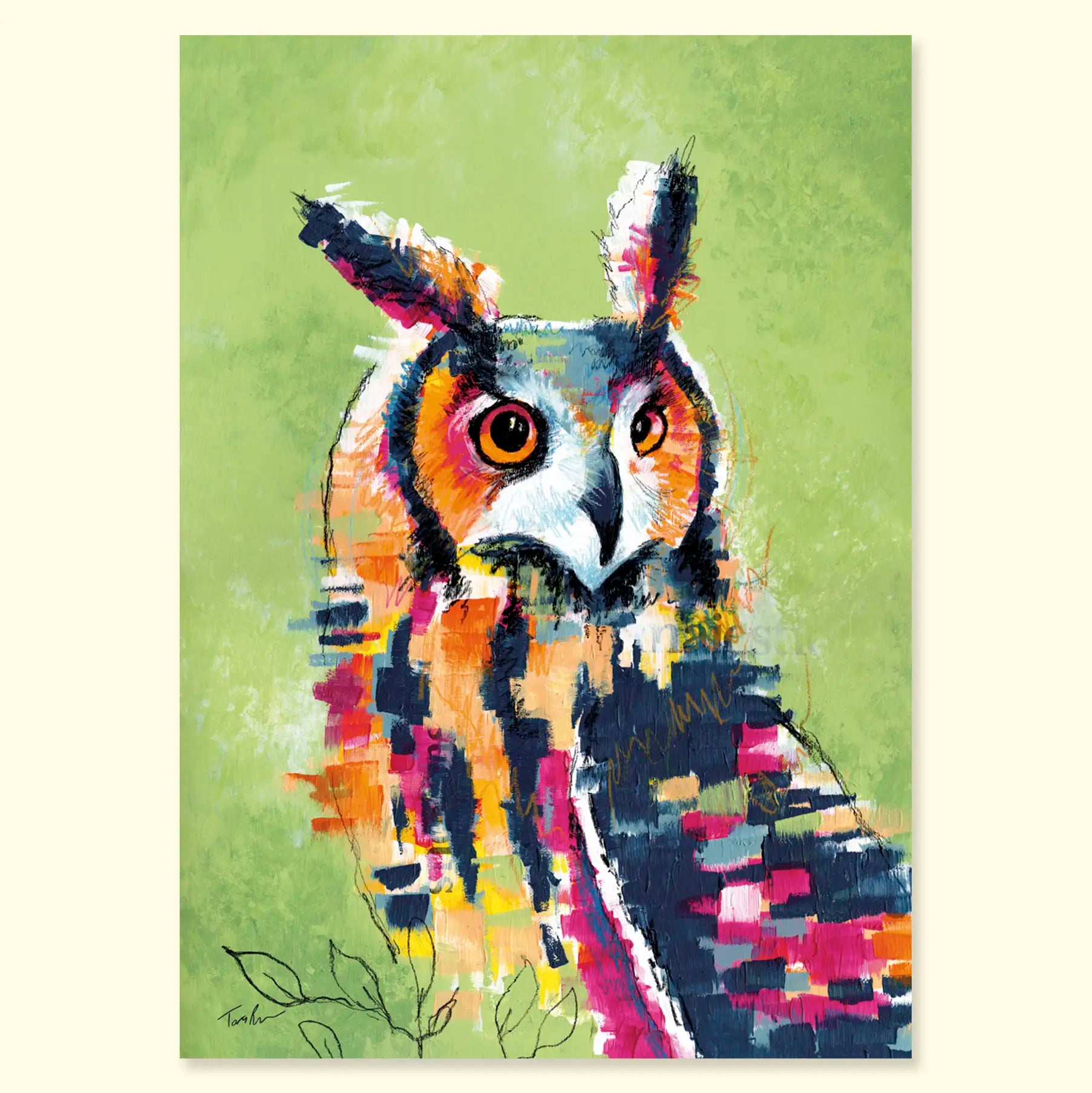 Vibrant colours and layered textures create a modern, dynamic take on the long-eared owl, adding character to any room.