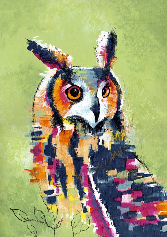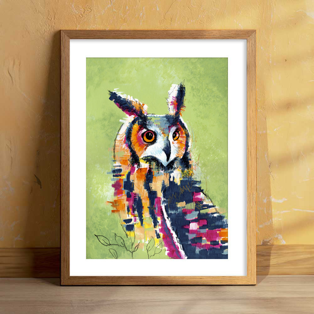 This vibrant owl art print uses bold colours and layered textures to offer a fresh, dynamic take on the long-eared owl.